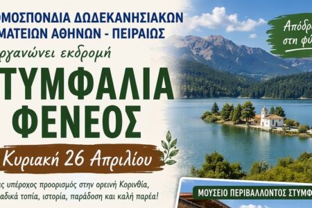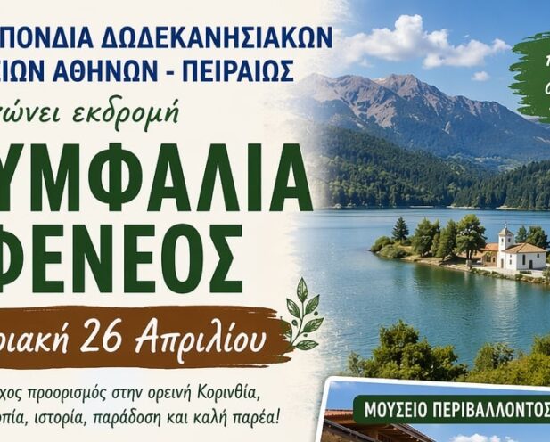 Η Ομοσπονδία Δωδεκανησιακών Σωματείων Αθηνών – Πειραιώς διοργανώνει μια όμορφη ανοιξιάτικη εκδρομή την Κυριακή 26 Απριλίου, σε έναν από τους πιο γραφικούς προορισμούς της ορεινής Κορινθίας! Πρόγραμμα εκδρομής: 08:30 – Αναχώρηση από Δημοτικό Θέατρο Πειραιά 09:00 – Παραλαβή από Αθήνα Read more…