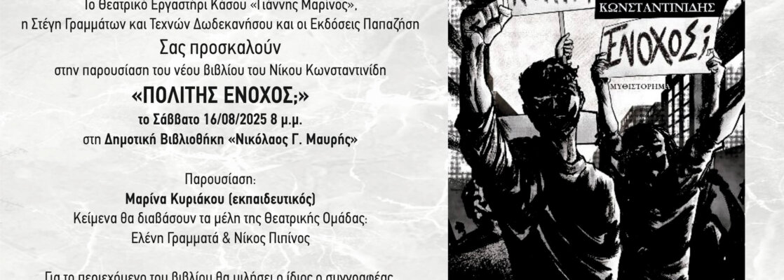 Ο Δήμος της Η.Ν. Κάσου και η Ομοσπονδία των Δωδεκανησιακών παροικιακών σωματίων σας προσκαλεί στην παρουσίαση του βιβλίου «Κάρπαθος & Κάσος – Οθωμανικά Φορολογικά Κατάστιχα» του Ιωάννη Β. Βασιλάκη που θα πραγματοποιηθεί την Τρίτη 26 Αυγούστου 2025 και ώρα 8.30μμ Read more…