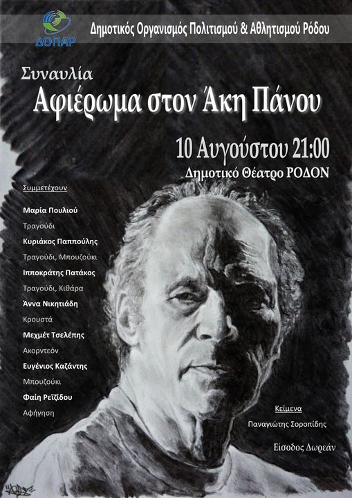 ![]() 10 Αυγούστου ,21:00 Θερινό ΚινΙτρο ΡΟΔΟΝ Συναυλία- αφιέρωμα στον Ακη Πάνου Συμμετέχουν οι μουσικοί ΜΑΡΙΑ ΠΟΥΛΙΟΥ Τραγούδι ΑΝΝΑ ΝΙΚΗΤΙΑΔΗ Κρουστά ΚΥΡΙΑΚΟΣ ΠΑΠΠΟΥΠΗΣ Μπουζούκι, Τραγούδι ΙΠΠΟΚΡΑΤΗΣ ΠΑΤΤΑΚΟΣ Κιθάρα, Τραγούδι ΜΕΧΜΕΤ ΤΣΕΠΕΠΗΣ Ακορντεόν ΕΥΓΕΝΙΟΣ ΚΑΖΑΝΤΗΣ Μπουζούκι ΦΑΙΗ ΡΕΊΖΙΔΟΥ Αφηγήτρια ΠΑΝΑΓΙΩΤΗΣ ΣΟΡΟΠΙΔΗΣ Επιμέλεια Read more…