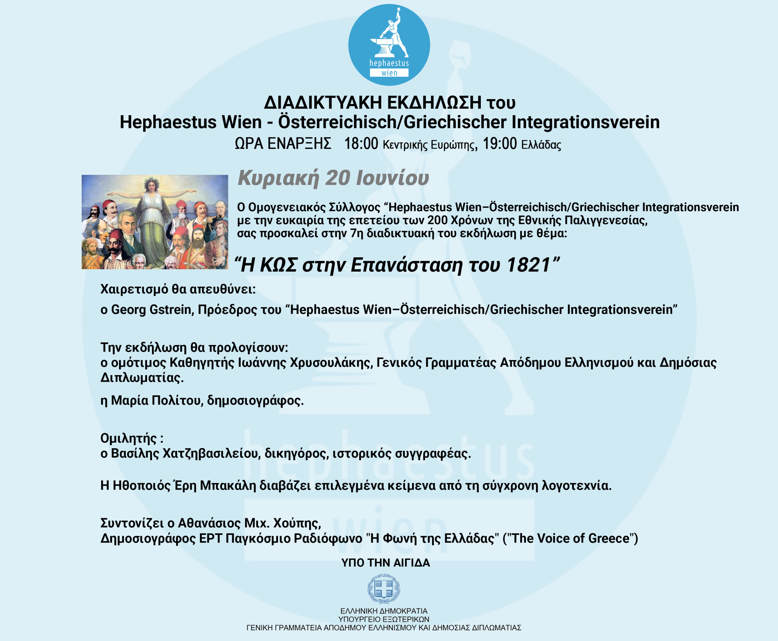 ON LINEΟ Ομογενειακός Σύλλογος “Hephaestus Wien–Österreichisch/Griechischer Integrationsverein με την ευκαιρία της επετείου των 200 Χρόνων της Εθνικής Παλιγγενεσίας, σας προσκαλεί στην 7η διαδικτυακή του εκδήλωση με θέμα: “Η ΚΩΣ στην Επανάσταση του 1821” Χαιρετισμό θα απευθύνει: o Georg Gstrein, Πρόεδρος Read more…