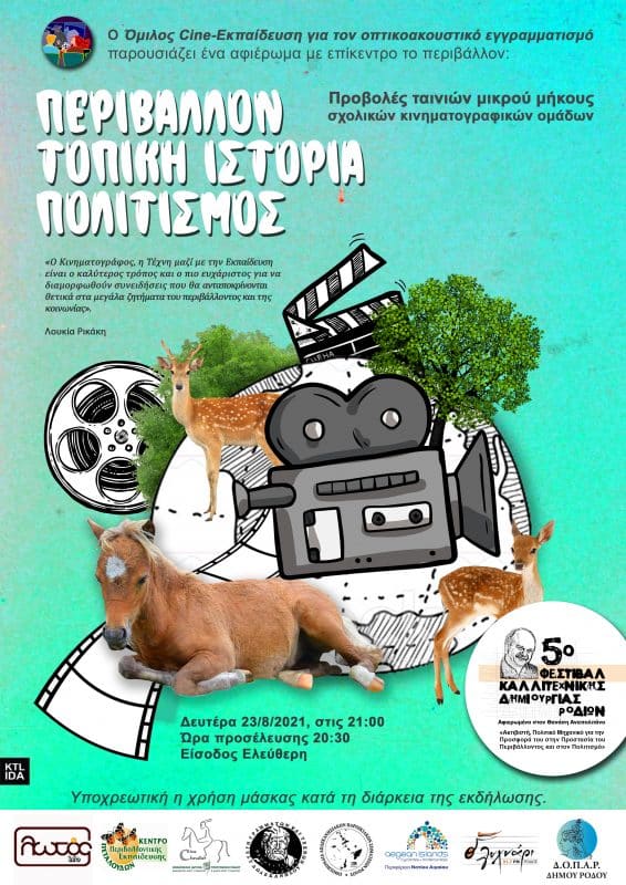 Ο Όμιλος «Cine-Εκπαίδευση για τον οπτικοακουστικό εγγραμματισμό» συμμετέχει και φέτος στο 5ο Φεστιβάλ Καλλιτεχνικής Δημιουργίας Ροδίων με ένα διήμερο κινηματογραφικό αφιέρωμα με θέμα «Περιβάλλον – Τοπική Ιστορία – Πολιτισμός».