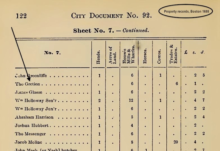 Αρχείο περιουσιακών στοιχείων του 1688 στο Boston – Το βέλος δείχνει το όνομα του Thomas Grecian