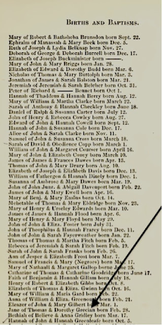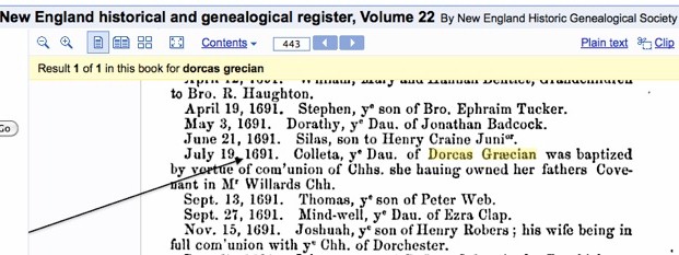 Το «Βορειοανατολικό Ιστορικό και Γενεαλογικό Αρχείο» δείχνει ότι το 1691 κάποια Colleta Grecian, κόρη του Dorcas και εγγονή του Thomas Grecian, βαπτίστηκε στην εκκλησία του Mr. Willard η οποία ήταν μια Παλιά Νότια Εκκλησία (Old South Church).