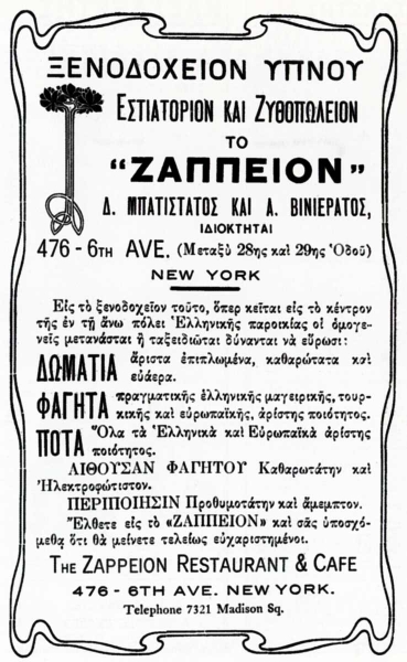 Το 1857 ο Σπύρος Μπαζάνος από τα Τζίτζινα της Σπάρτης άνοιξε ένα μικρό ελληνικό εστιατόριο με το όνομα «Πελοπόννησος» στην οδό Ρούζβελτ αρ. 7, στο κάτω τμήμα του Μανχάτταν. Λίγο αργότερα άρχισαν να λειτουργούν και δύο ξενοδοχεία ύπνου και φαγητού, «μικρά και ακάθαρτα τοιαύτα» για τους Έλληνες ναυτικούς κυρίως, το ένα στην οδό Γουώτερ και το άλλο στην οδό Φέρρυ, που ανήκε σε κάποιον Σκοπελίτη.