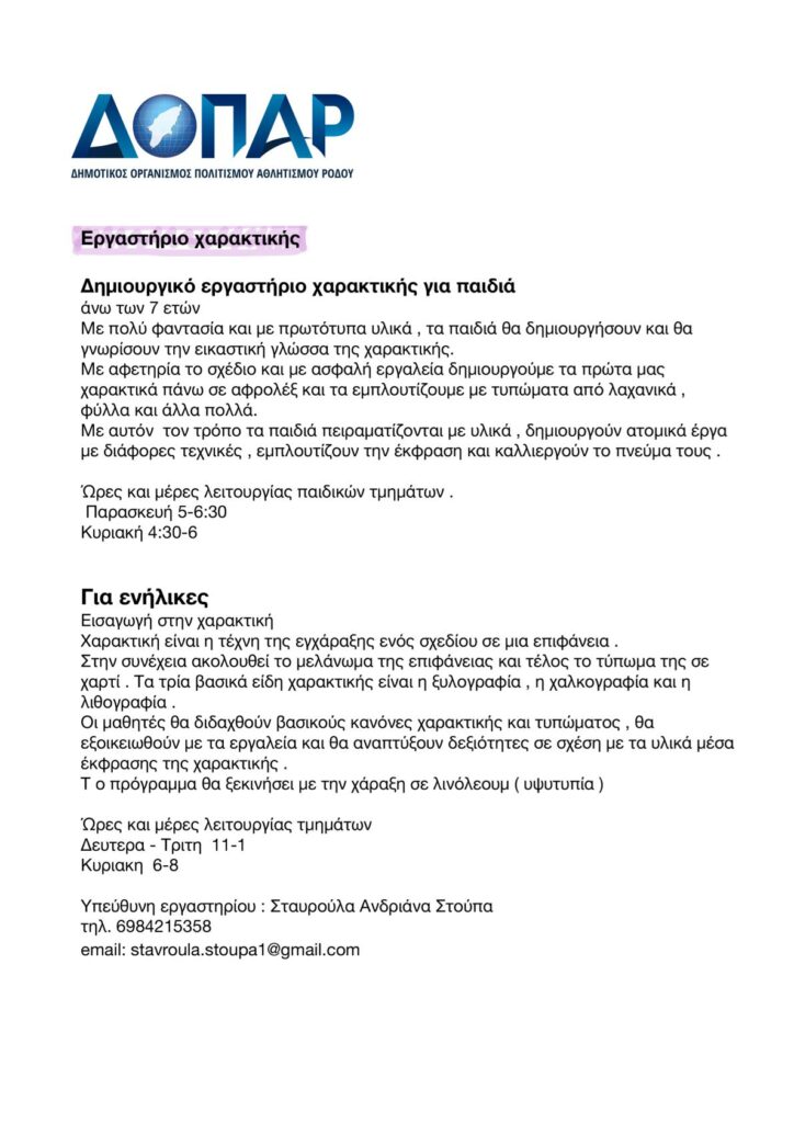 Για ενημέρωση των ωρών και ημερών των μαθημάτων και για οποιαδήποτε άλλη πληροφορία επικοινωνήστε με το ΔΟΠΑΡ στο 2241026385.