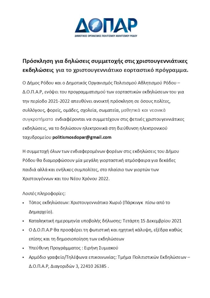 ΔΟΠΑΡ-Πρόσκληση για δηλώσεις συμμετοχής στις Χριστουγεννιάτικες εκδηλώσεις