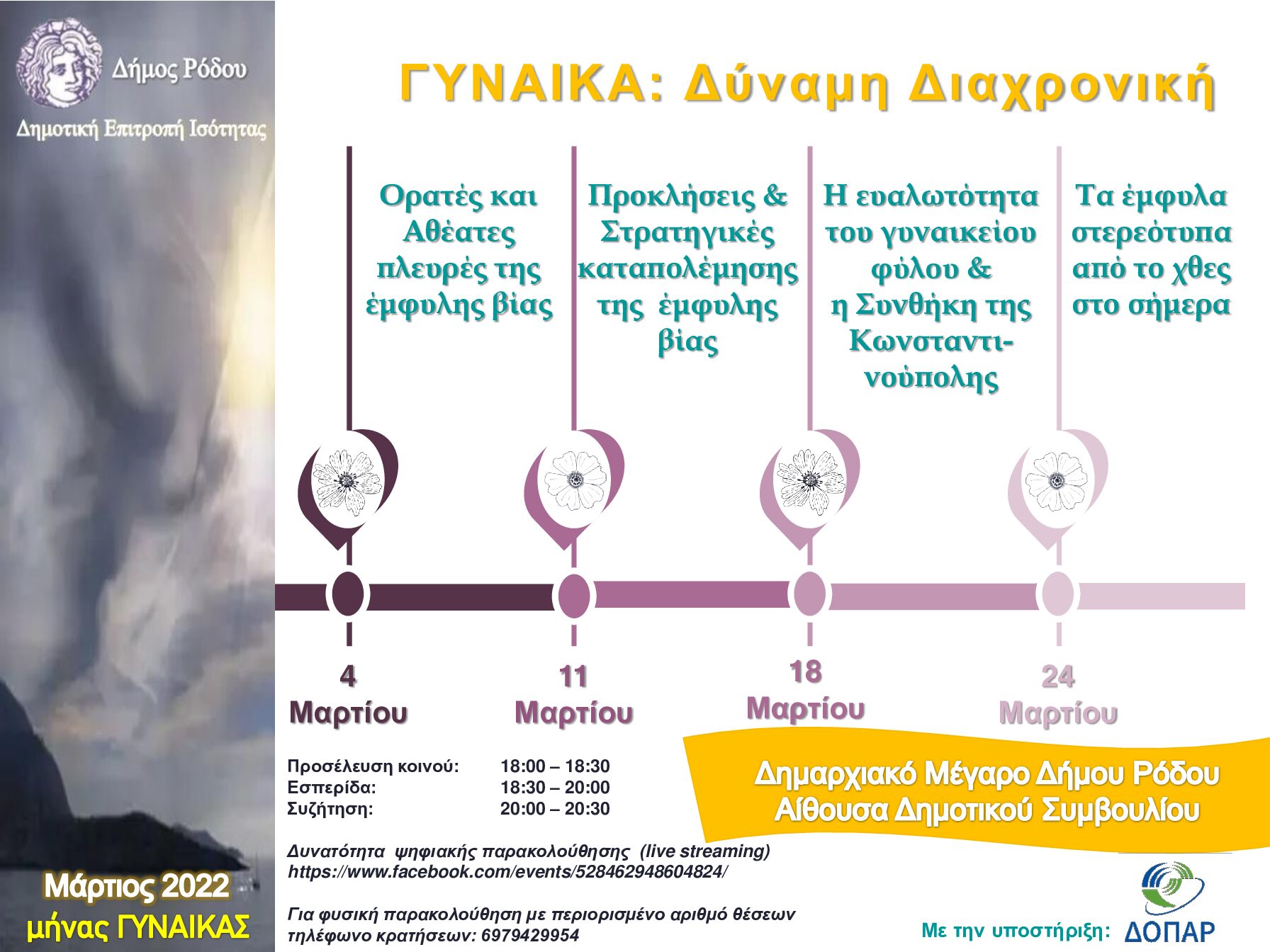 | Παρασκευή 4 18:00 – 21:00 | Δημοτική Επιτροπή Ισότητας Δήμου Ρόδου 1η Εσπερίδα: Γυναίκα: Δύναμη Διαχρονική Αίθουσα Δημοτικού Συμβουλίου Link: https://www.facebook.com/events/528462948604824/ |