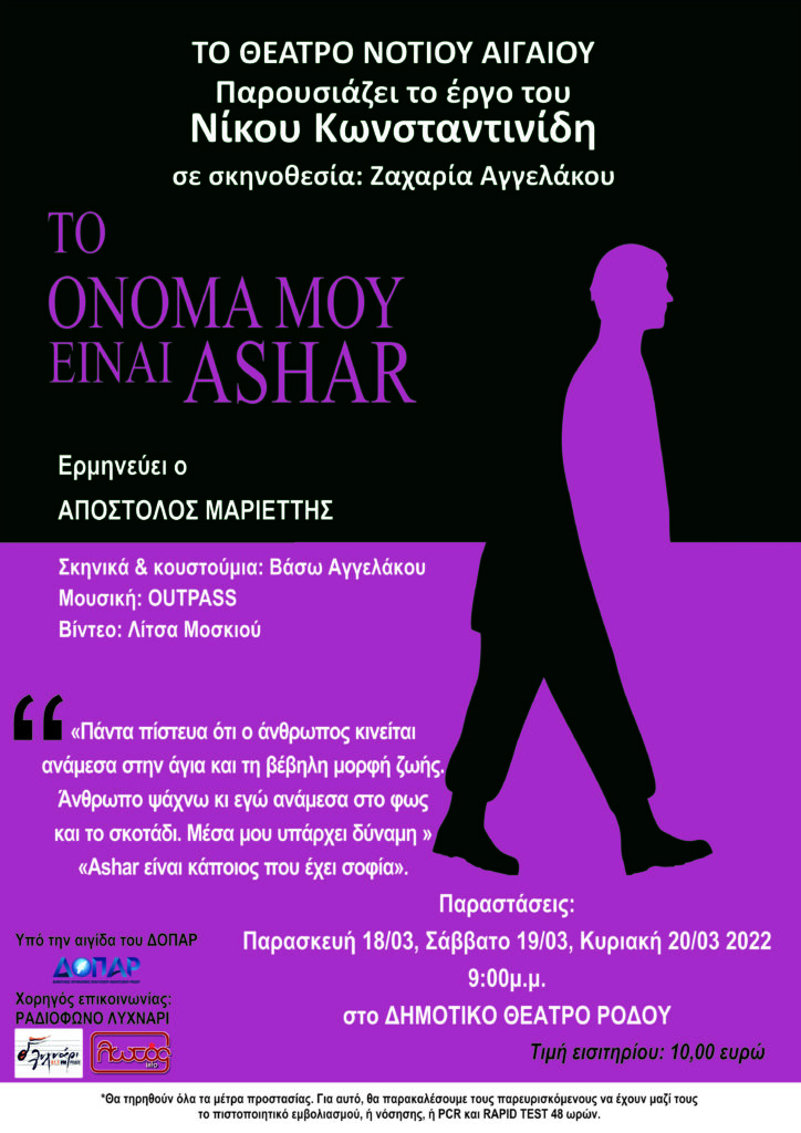 “ΤΟ ΟΝΟΜΑ ΜΟΥ ΕΙΝΑΙ ASHAR” ΘΕΑΤΡΙΚΕΣ ΠΑΡΑΣΤΑΣΕΙΣ 18, 19, 20/ ΜΑΡΤΙΟΥ ΣΤΟ ΔΗΜΟΤΙΚΟ ΘΕΑΤΡΟ ΡΟΔΟΥ !