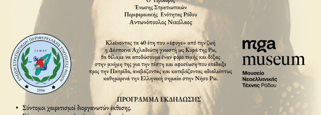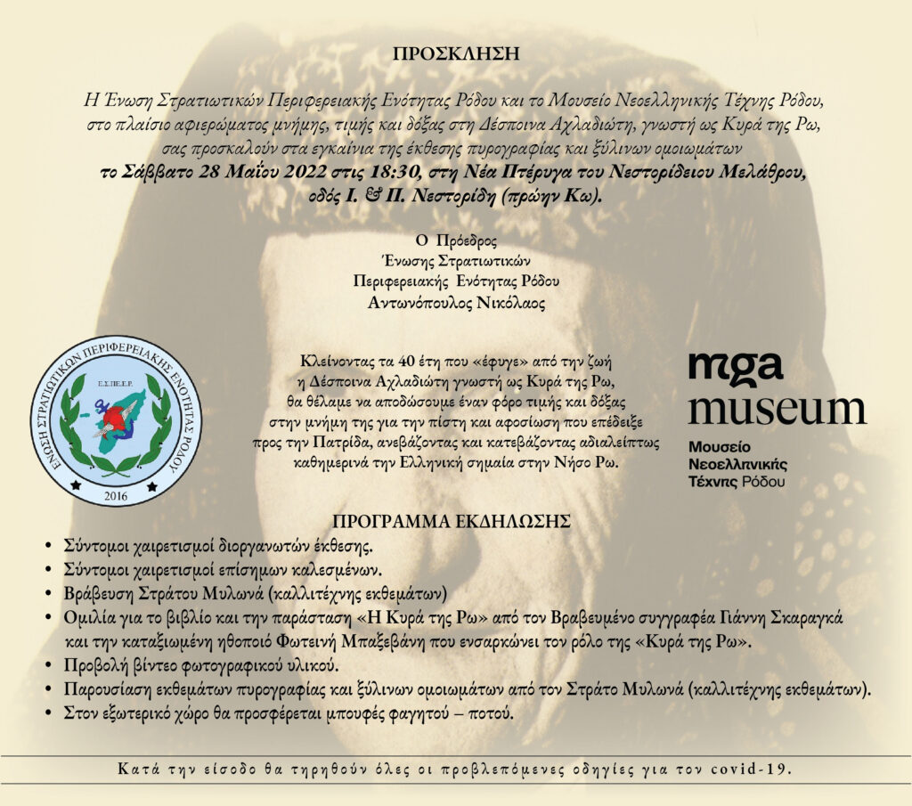 Η Ένωση Στρατιωτικών Περιφερειακής Ενότητας Ρόδου και το Μουσείο Νεοελληνικής Τέχνης Ρόδου, στο πλαίσιο αφιερώματος μνήμης, τιμής και δόξας στη Δέσποινα Αχλαδιώτη, γνωστή ως Κυρά της Ρω, σας προσκαλούν στα εγκαίνια της έκθεσης πυρογραφίας και ξύλινων ομοιωμάτων το Σάββατο 28 Μαΐου 2022 στις 18:30, στη Νέα Πτέρυγα του Νεστορίδειου Μελάθρου, οδός Ι. & Π. Νεστορίδη (πρώην Κω).
