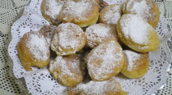 - Βάζουμε τη μαγιά σ’ ένα μπολ μ’ ένα φλιτζάνι χλιαρό νερό να διαλυθεί και προσθέτουμε ένα φλιτζάνι αλεύρι ώστε να γίνει ένας πηχτός χυλός. Το αφήνουμε μίση ώρα να φουσκώσει, μετά προσθέτουμε όλα τα υλικά και το νερό λίγο ώσπου να γίνει μια ζύμη όπως τους λουκουμάδες. Τη ζύμη την κοπανάμε πάνω κάτω με την παλάμη μας. Αφήνουμε 1 ώρα να φουσκώσει. Στην επιφάνεια της ζύμης θα σχηματιστούν μικρές φουσκαλίτσες. Όταν οι φουσκαλίτσες αρχίζουν να σκάνε η ζύμη είναι έτοιμη για τηγάνισμα.
