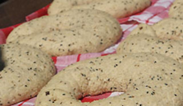 Ζυμώνετε το αλεύρι με τη μαγιά και όλα τα υπόλοιπα υλικά, προσθέτοντας όσο νερό χρειαστεί για να γίνει η ζύμη εύπλαστη. Τη χωρίζετε σε μπαλίτσες και φτιάχνετε κλώνους τους οποίους τους κυλάτε για λίγο στο βρεγμένο σουσάμι μέχρι να καλυφθούν και τους κλείνετε σε στρογγυλά κουλούρια. Ψήνετε στους 200° C μέχρι να ροδίσουν αρκετά. Σβήνετε το φούρνο και αφήνετε τα κουλουράκια να σκληρύνουν.