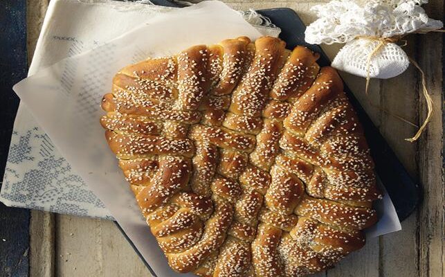 Ετοιμάζουμε προζύμι ρίχνοντας σε λεκάνη το 1 κιλό αλεύρι και τη μαγιά, την οποία έχουμε προηγουμένως διαλύσει σε λίγο χλιαρό νερό. Ανακατεύουμε μέχρι να σχηματιστεί ένας πηχτός χυλός. Σκεπάζουμε με πετσέτα και τον αφήνουμε σκεπασμένο μακριά από ρεύματα αέρα για μία νύχτα. Την επόμενη μέρα, ζυμώνουμε το σιμιγδάλι μαζί με το υπόλοιπο αλεύρι και το ελαιόλαδο. Στη συνέχεια, προσθέτουμε το προζύμι, τη μαστίχα, το μαχλέπι, το γλυκάνισο, τη ζάχαρη και όσο νερό χρειαστεί μέχρι να γίνει εύπλαστο το ζυμάρι. Αφήνουμε για 3-4 ώρες να ξεκουραστεί. Κόβουμε κομμάτια από τη ζύμη και πλάθουμε μεγάλα κουλούρια. Συνεχίζουμε πλάθοντας λεπτά κορδόνια από τη ζύμη και τα κολλάμε πάνω στα κουλούρια μας σχηματίζοντας «ψάθα». Ραντίζουμε την επιφάνειά τους με νερό και πασπαλίζουμε με σουσάμι. Ψήνουμε σε προθερμασμένο φούρνο στους 170°C για μισή ώρα περίπου.