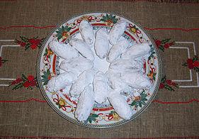 Ασπρίζουμε τα αμύγδαλα και μαζί με τα καρύδια τα ψιλοκοπανίζουμε. Τα βάζουμε σε λεκάνη ,ρίχνουμε τη ζάχαρη, το μοσχοκάρυδο και την ψίχα ψωμιού. Ανακατεύουμε και ζυμώνουμε, ρίχνοντας λίγο ανθόνερο, ώσπου να πλάθονται. Τα πλάθουμε σαν μικρά μισοφέγγαρα και τα βάζουμε σε ταψί στρωμένο με λαδόκολλα. Τα ψήνουμε σε μέτριο φούρνο, ώσπου να πάρουν χρώμα. Για να τα ξεκολλήσουμε βρέχουμε τη λαδόκολλα λίγο από κάτω .Τα βουτάμε σε ανθόνερο και τα βάζουμε σε πετσέτα να στραγγίσουν λίγο. Τα τυλίγουμε με ζάχαρη άχνη.
