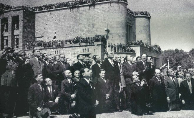Αίφνης, καπέλα και μανδήλια σείονται από ενθουσιασμόν και δάκρυα συγκινήσεως γεμίζουν τα μάτια του αναμένοντος λαού.