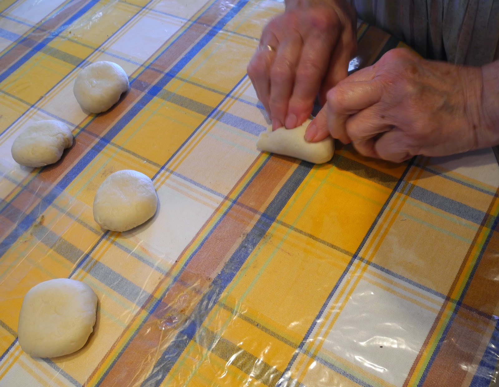 Παίρνουμε ένα κομμάτι από τη ζύμη και το χωρίζουμε σε 4 με 5 μικρά μπαλάκια σαν ένα μέτριο μανταρίνι.