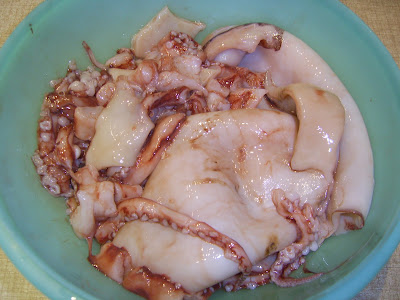 Καθαρίζουμε τα καλαμάρια και ψιλοκόβουμε τα πλοκάμια.