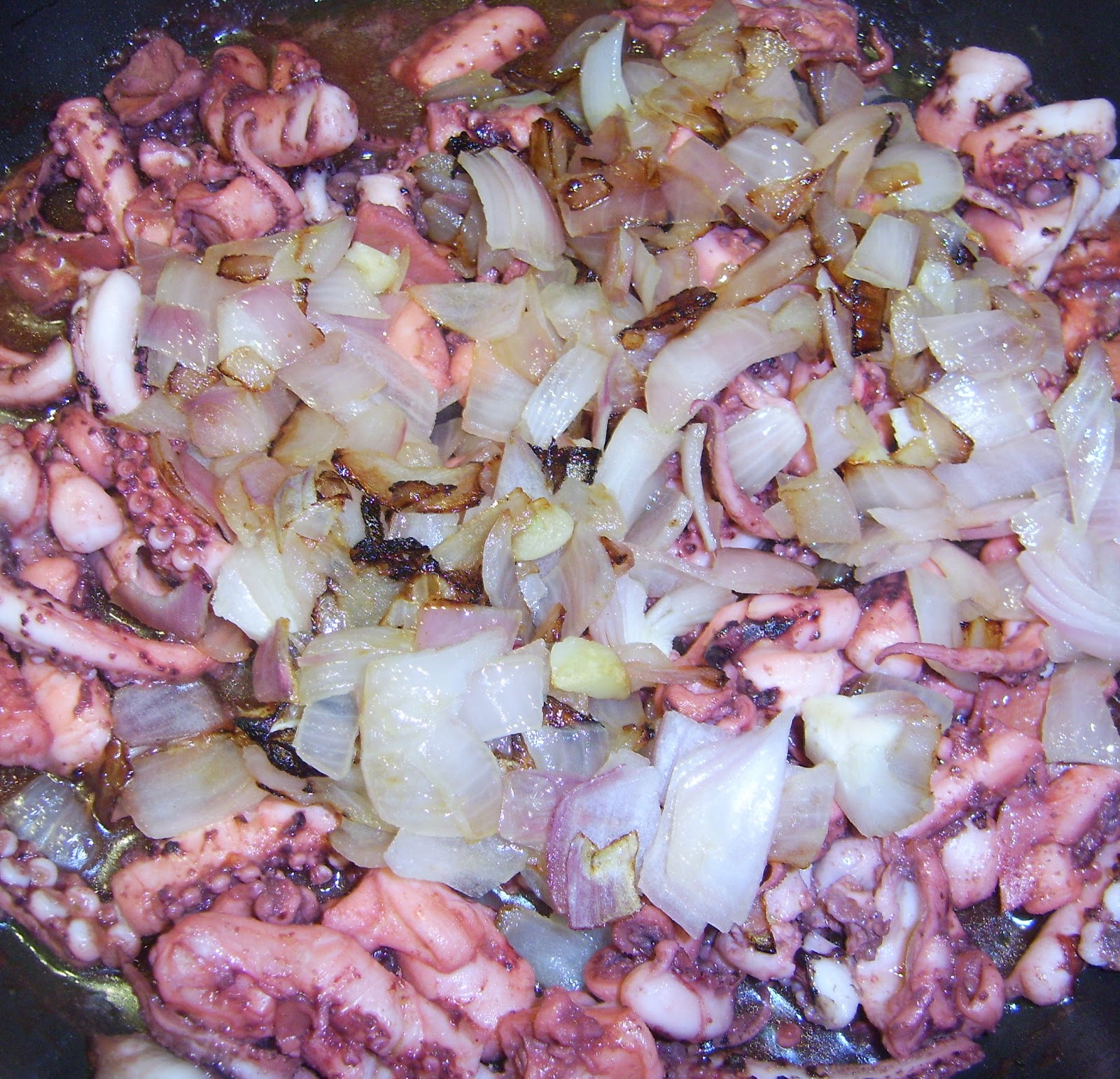 Τσιγαρίζουμε σε λίγο από το λάδι το κρεμμύδι, το σκόρδο και τα πλοκάμια.