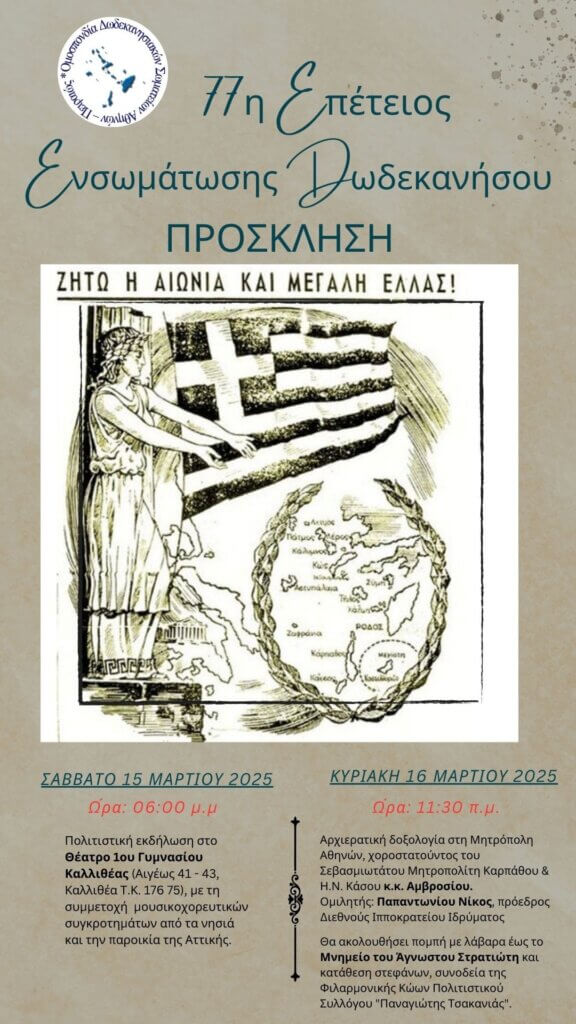 ΠΡΟΣΚΛΗΣΗ ΕΟΡΤΑΣΜΟΥ 77ης ΕΠΕΤΕΙΟΥ ΕΝΣΩΜΑΤΩΣΗΣ ΔΩΔΕΚΑΝΗΣΟΥ