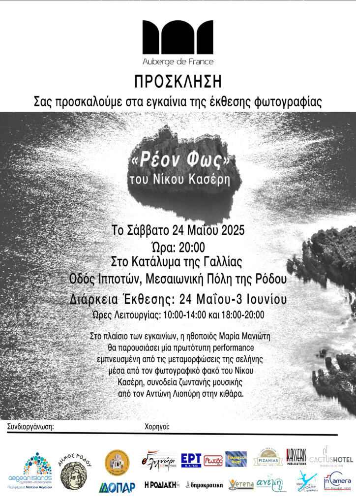 Το Κατάλυμα της Γαλλίας παρουσιάζει την έκθεση φωτογραφίας του Νίκου Κασέρη με τίτλο Ρέον Φως, σε επιμέλεια της Νιτούς Ανθούση. Η έκθεση εγκαινιάζεται το Σάββατο 24 Μαΐου 2025, στις 20:00, στην οδό Ιπποτών στην Μεσαιωνική Πόλη της Ρόδου,και θα διαρκέσει μέχρι τις 3 Ιουνίου.