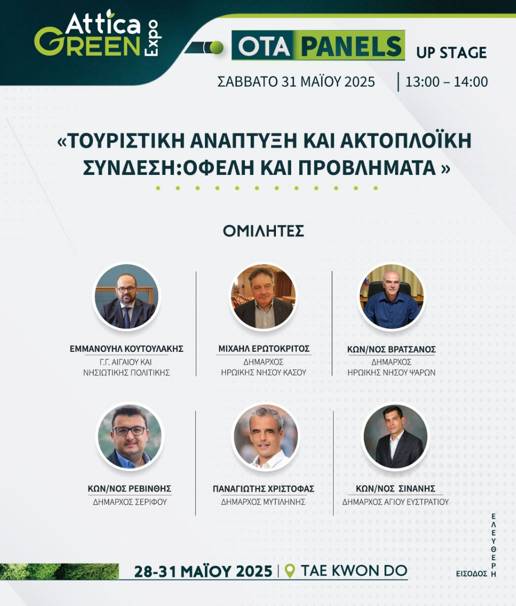 Το Σάββατο 31/5, στο κλειστό Ολυμπιακό Γήπεδο Παλαιού Φαλήρου (Tae Kwon Do), στο πλαίσιο της έκθεσης Attica Green Expo στα OTA Panels του Up Stage 13.00 -14.00 συμμετέχουν ως ομιλητές
