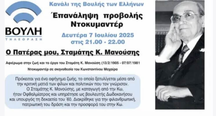 Επανάληψη προβολής ντοκιμαντέρ για την επέτειο του θανάτου του Σταμάτη Μανούση σήμερα Δευτέρα 7 Ιουλίου 2025 στις 21.00 το βράδυ απο τον τηλεοπτικό σταθμό της ΒΟΥΛΗΣ των Ελλήνων με τίτλο “Πατερας Σταματης Κ. Μανούσης”.