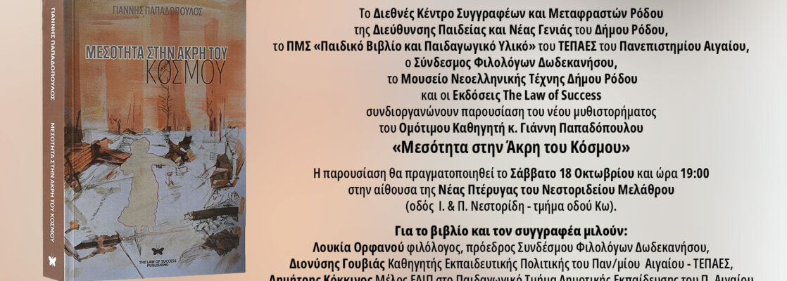 Δ/ση Παιδείας και Νέας Γενιάς – Παρουσίαση Μυθιστορήματος του κ. Γιάννη Παπαδόπουλου