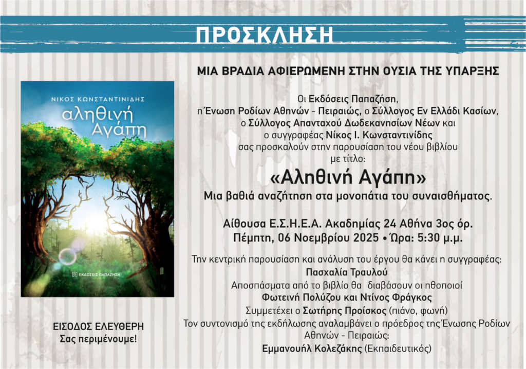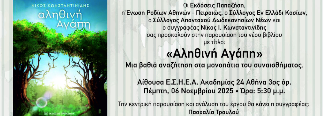 ΠΑΡΟΥΣΙΑΣΗ ΒΙΒΛΙΟΥ “ΑΛΗΘΙΝΗ ΑΓΑΠΗ” του ΝΙΚΟΥ ΚΩΝΣΤΑΝΤΙΝΙΔΗ