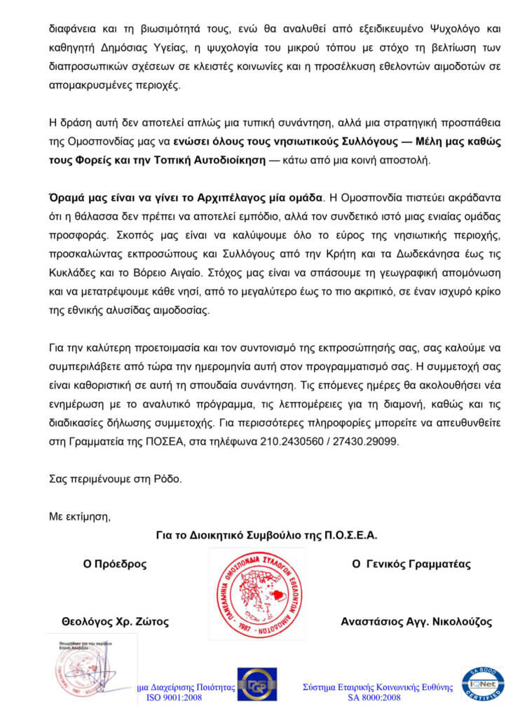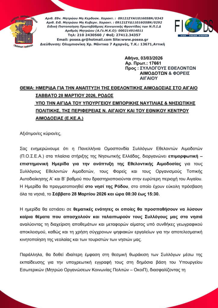 ΗΜΕΡΙΔΑ ΓΙΑ ΤΗΝ ΑΝΑΠΤΥΞΗ ΤΗΣ ΕΘΕΛΟΝΤΙΚΗΣ ΑΙΜΟΔΟΣΙΑΣ ΣΤΟ ΑΙΓΑΙΟ-ΣΑΒΒΑΤΟ 28 ΜΑΡΤΙΟΥ 2026, ΡΟΔΟΣ