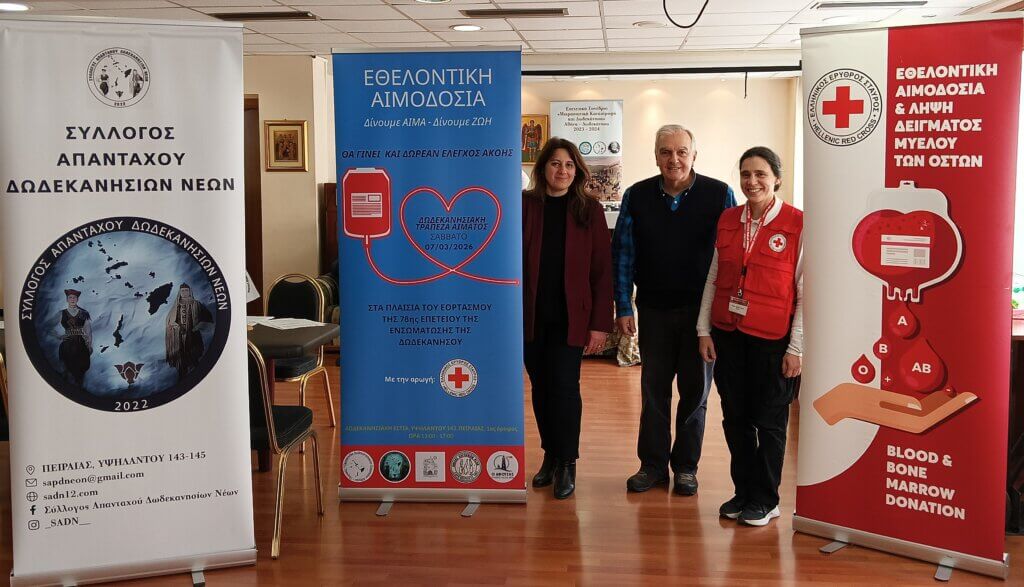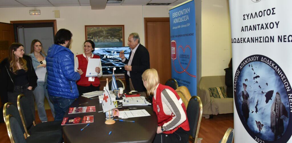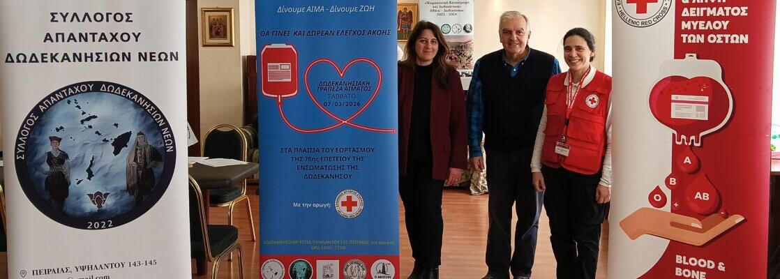 Η Ομοσπονδία μας, σε συνεργασία με όλα τα Δωδεκανησιακά Σωματεία της Αττικής, πραγματοποίησε εθελοντική αιμοδοσία το Σάββατο 7 Μαρτίου, ανήμερα της 78ης επετείου της Ενσωμάτωσης της Δωδεκανήσου, στη Δωδεκανησιακή Εστία του Πειραιά, προκειμένου να συνεχίσει να συμβάλλει στην ικανοποίηση των αναγκών σε αίμα όσο το δυνατό περισσοτέρων συμπατριωτών μας.