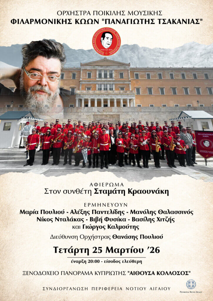 Σας προσκαλούμε στη 1η Συναυλία της Ορχήστρας Ποικίλης Μουσικής της Φιλαρμονικής Κώων ΄΄ΠΑΝΑΓΙΩΤΗΣ ΤΣΑΚΑΝΙΑΣ ΄΄σε ένα μουσικό αφιέρωμα στονμουσικοσυνθέτη Σταμάτη Κραουνάκη , την Τετάρτη 25 Μαρτίου 2026 και ώρα 20.00 στο Ξενοδοχείο Πανόραμα Κυπριώτης ,αίθουσα Κολοσσός .
