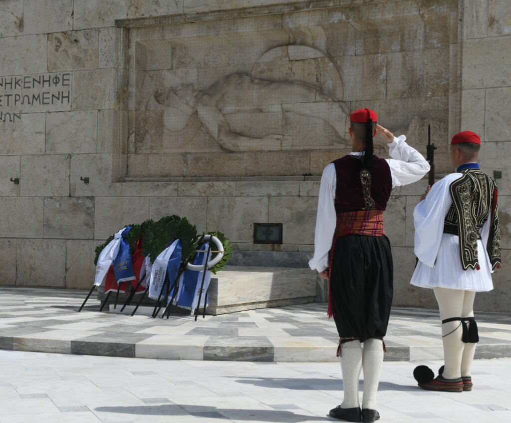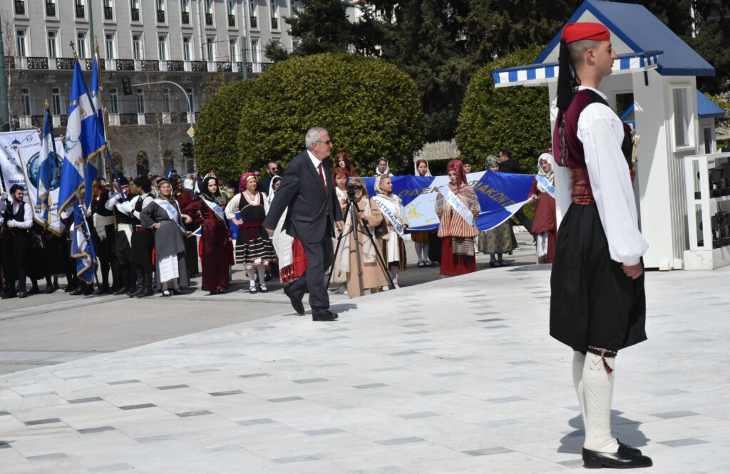 Ακολούθησε η καθιερωμένη πομπή με την συνοδεία της Φιλαρμονικής Κώων Πολιτιστικού Συλλόγου «Παναγιώτης Τσακανιάς», από τον Καθεδρικό Ναό Αθηνών μέχρι το Μνημείο του Αγνώστου Στρατιώτη στο Σύνταγμα, όπου η Προεδρική φρουρά έφερε τη στολή του Βρακοφόρου του Αιγαίου Αρχιπελάγους. Η πομπή έκανε μια στάση για προσευχή στο σημείο αναγραφής των 57 θυμάτων της τραγωδίας των Τεμπών.