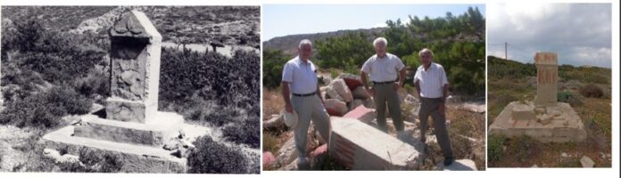 Around 2004, some people cut down the pine trees that had since sprouted again and “sown” barley, with the tolerance of the authorities, and then tried to destroy the third monument with a bulldozer. They tore down the second tier and threw the tombstone from its place. Because they were unable to tear down the first tier, they carried rubble from a building and threw it on the top of the monument. They did not respect the eternal home of our fellow human beings who, during the difficult years of the war, breathed their last breath in Karpathos.