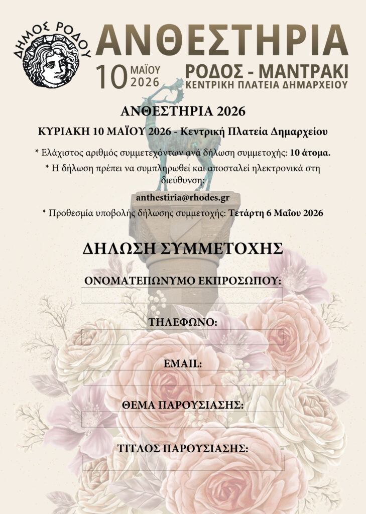 Η προθεσμία για δηλώσεις συμμετοχής είναι μέχρι την Τετάρτη 6 Μαΐου και υποβάλλονται στην ηλεκτρονική διεύθυνση anthestiria@rhodes.gr