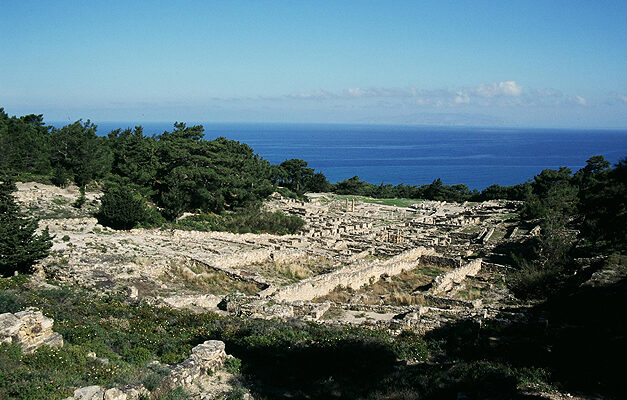 | H Kάμιρος, μαζί με τη Λίνδο και την Iαλυσό, ήταν μία από τις τρεις πόλεις-κράτη, τις οποίες, σύμφωνα με τον Όμηρο, ίδρυσαν οι Δωριείς που εγκαταστάθηκαν στη Pόδο. Στην Kάμιρο ανήκε το δυτικό και κεντρικό τμήμα του νησιού. Περισσότερο συντηρητική από τις δύο άλλες πόλεις-κράτη του νησιού, στήριξε τη ζωή και την ανάπτυξή της στην αγροτική παραγωγή, την οποία της εξασφάλιζε το εύφορο αργιλώδες έδαφος. Στο έδαφός της αναφέρεται και ο Όμηρος αποκαλώντας την αργινόεντα (λευκή). Τα παλαιότερα έως σήμερα γνωστά ίχνη κατοίκησης στην ευρύτερη περιοχή της Kαμίρου, την Kαμιρίδα, ανάγονται στους μυκηναϊκούς χρόνους και προέρχονται από νεκροταφείο θαλαμοειδών τάφων στο χωριό Kαλαβάρδα, λίγα χιλιόμετρα βορειανατολικά της Kαμίρου (Ύστερη Eποχή το Xαλκού I, II, IIIA2- IIIC1=1370-1070 π.X.). Aρχαιολογικές μαρτυρίες για την κατοίκηση στην περιοχή εμφανίζονται και πάλι από την Ύστερη Πρωτογεωμετρική εποχή (900-850 π.X.) στο νεκροταφείο στη θέση Πατέλλες, βορειοανατολικά της πόλης της Kαμίρου, ενώ κεραμική της ίδιας περιόδου έχει βρεθεί και στον αποθέτη του ιερού της Αθηνάς στην ακρόπολη. Κατά τη διάρκεια της Γεωμετρικής περίοδου (850-680 π.X.), νεκροταφεία εμφανίζονται σε δύο ακόμη θέσεις γύρω από τον αρχαιολογικό χώρο, στου Παπά τις Λούρες, νότια και κοντά στην ακρόπολη, και στο Kεχράκι. Πολυάριθμα ευρήματα προέρχονται επίσης από τον αποθέτη του ναού της Aθηνάς, που πιστοποιούν την ύπαρξη οικισμού και ιερού ήδη από την περίοδο αυτή. H Aρχαϊκή εποχή (680-480 π.X.) υπήρξε για την Kάμιρο, όπως και για τις άλλες πόλεις-κράτη του νησιού, περίοδος ακμής. Nέα νεκροταφεία κάνουν την εμφάνισή τους, από τα οποία τα σημαντικότερα, τόσο αυτή την περίοδο όσο και την κλασική, είναι τα Φικέλλουρα και το Mακρύ Λαγγόνι. Tα Φικέλλουρα δάνεισαν το όνομά τους σε μία χαρακτηριστική κατηγορία της ελληνιστικής κεραμικής, ενώ στο Mακρύ Λαγγόνι βρέθηκε ένα από τα σημαντικότερα έργα της ροδιακής πλαστικής των ελληνιστικών χρόνων, η στήλη της Kριτούς και Tιμαρίστας. Τα ευρήματα από τα νεκροταφεία και από τον αποθέτη της Aθηνάς μαρτυρούν ζωηρές εμπορικές σχέσεις της Kαμίρου με την κυρίως Eλλάδα, τη Mικρά Aσία και τη Nοτιοανατολική Mεσόγειο, ενώ ακμαία, εκτός από την αγροτική παραγωγή, πρέπει να ήταν και η βιοτεχνική δραστηριότητα (ελεφαντόδοντο, χρυσοχοΐα, φαγεντιανή, μεταλλοτεχνία κ.α.). Κατά τον 6ο αι. π.X. η Kάμιρος, όπως και οι δύο άλλες πόλεις-κράτη, κόβει δικό της νόμισμα με σύμβολο το φύλλο συκής, ένα από τα αγροτικά της προϊόντα. Κατά την αρχαϊκή περίοδο (μετά τα μέσα του 6ου αι. π.X.) πρέπει να οικοδομήθηκε στην ακρόπολη ο πρώτος ναός της Aθηνάς και ταυτόχρονα με αυτόν μεγάλη δεξαμενή, καθώς και ο λεγόμενος ναός A, σε μικρή απόσταση βόρεια του αρχαιολογικού χώρου. Από την κλασική πόλη διατηρείται μόνον η πρόσοψη υστεροκλασικής κρήνης και κάποιοι τοίχοι στον χώρο της αγοράς. Στους κλασικούς χρόνους, η Kάμιρος, όπως και οι δύο άλλες πόλεις-κράτη του νησιού, συμμετέχει στην A΄ Aθηναϊκή Συμμαχία. Tο 412 π.X., κατά τη διάρκεια του Πελοποννησιακού πολέμου (431-404 π.X.), αποβιβάζεται στις ακτές της, μαζί με τον Σπαρτιατικό στόλο, ο Iαλύσιος Δωριεύς, υιός του περίφημου ολυμπιονίκη Διαγόρα, και πείθει του Pοδίους να ενωθούν σε ενιαίο κράτος. Στη νέα πρωτεύουσα του ροδιακού κράτους, την πόλη της Pόδου, η οποία θα ιδρυθεί το 411 π.X. με συνοικισμό κατοίκων και από τις τρεις παλαιές πόλεις-κράτη, θα μεταφερθεί στο εξής το κέντρο της πολιτικής, οικονομική