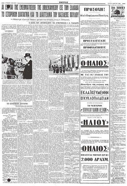 Από το Σάββατον, 06 Μαρτίου, σύσσωμος ο δωδεκανησιακός λαός, με ανυπομονησίαν περιμένει να πανηγυρίση την μεγάλην ημέραν, την οποίαν ωνειρεύθησαν, και δια την οποίαν ηγωνίσθησαν και εθυσιάσθησαν τόσαι γενεαί αφανών και γνωστών μαρτύρων.Ας είναι αιωνία η μνήμη των και ας αισθανθούν τώρα ανάλαφρον πλέον το χώμα του τάφου των. Απ′ όλα τα χωριά της Ρόδου λαός αρίφνητος έχει κατακλύσει την πρωτεύουσαν της Δωδεκανήσου. Σύμπαν τον ελληνικόν έθνος από βορρά έως νότου και από των Ακροκεραυνείων ως την Κύπρον, πέραν από χώρες, πελάγη, βουνά και ωκεανούς, σιωπηλόν και υπερήφανον, πλημμυρισμένον ψυχικής αγαλλιάσεως, αναμένει να υποδεχθή την Δωδεκάνησον, κομμάτι αδιαίρετον της ελληνικής πατρίδος, σάρκα εκ της σαρκός του και οστούν εκ των οστών του. Από την πρωτεύουσαν έχουν ήδη εκκινήσει διά την Ρόδον οι αντιπρόσωποι του Κράτους και του λαού.