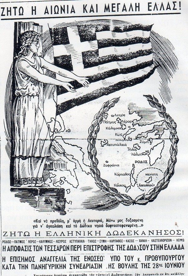 » Σήμερον, όπως ετόνισε και η διακήρυξις της Συνελεύσεως της Πάτμου, την 4ην Ιουνίου 1912, με τας υπογραφάς των 12 αντιπροσώπων των Νήσων, σήμερον ο εθνικός πόθος, ο προαιώνιος πόθος των Αιγαιέων, της ενώσεως των μετά της Μητρός Ελλάδος, πραγματοποιείται. Με ένα εθνικόν γεγονός, η ιστορική σημασία του οποίου θα μεγαλώνη, εφ” όσον ο χρόνος θα παρέρχεται. Και ο Ελληνισμός θα συνεχίζη τον ιστορικόν δρόμον που ήρχισε?»