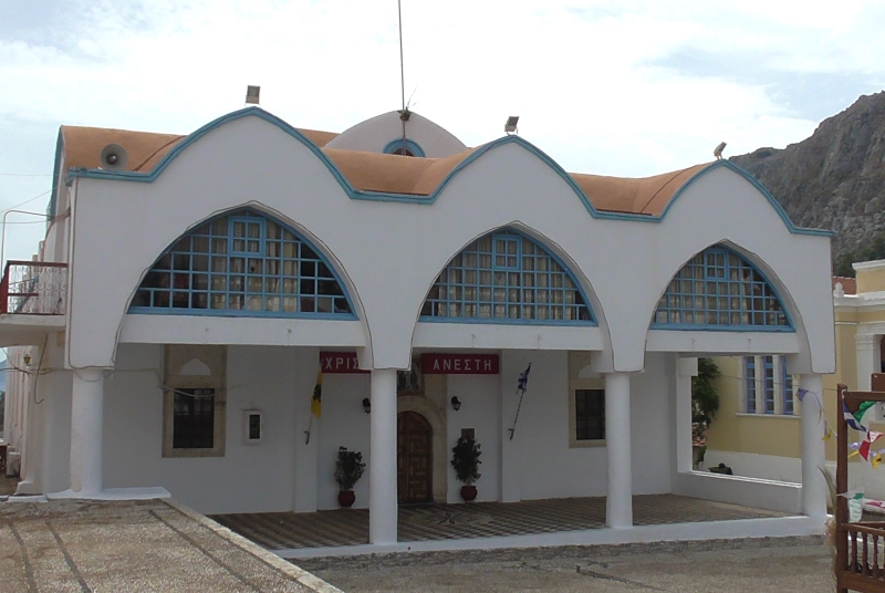 Πάνω στην πλατεία, δεσπόζει ο ναός των Αγίων Κωνσταντίνου και Ελένης του 1835, που είναι η Μητρόπολη του νησιού, χαρακτηριστικό δείγμα τρίκλιτης βασιλικής του ιδιαίτερου δωδεκανησιακού τύπου με ένα πανέμορφο ψηλό εξωτερικό καμπαναριό. Στο εσωτερικό, θα θαυμάσετε το μαρμάρινο τέμπλο, αλλά και τους δώδεκα μονολιθικούς γρανιτένιους κίονες που στηρίζουν τη στέγη και μεταφέρθηκαν από τον αρχαίο ναό του Απόλλωνα στα Πάταρα της Λυκίας. Ο ναός, βρίσκεται ανάμεσα σε δύο επίσης ιστορικά κτήρια του νησιού τα οποία ενώνει μια όμορφη βοτσαλωτή αυλή, το παλιό Παρθεναγωγείο και την Σαντράπειο Αστική Σχολή, ένα ωραίο νεοκλασικό κτήριο που εγκαινιάστηκε το 1903 και χτίστηκε με βάση το σχέδιο του Πανεπιστημίου της Αθήνας. Η Σαντράπειος είναι σήμερα το μοναδικό σχολείο του νησιού, φιλοξενώντας ταυτόχρονα τις τάξεις του Δημοτικού, του Γυμνασίου και του Λυκείου.