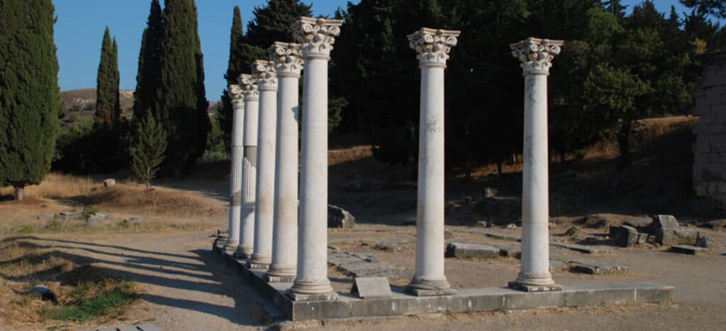 Ερείπια της πόλης, Αγορά και Παλιό Λιμάνι: Κάτω από τα ερείπια του σεισμού του 1933, οι ανασκαφές αποκάλυψαν το σχέδιο της αρχαίας πόλης, τα δημόσια κτήρια, τα ιερά και τις οικίες. Τότε ανακαλύφθηκαν και διακρίνονται μέχρι σήμερα, τμήματα της Αρχαίας Αγοράς (4ου- 3ου αι. π.Χ.), η Μεγάλη Στοά και άλλες μικρότερες στοές με ιερά. Στο εσωτερικό της πόλης υπάρχει το Ωδείο (3ου αι. π.Χ.) με 12 καλά διατηρημένες κερκίδες και θολωτές στοές αλλά και το Ξυστό, μέρος του Γυμναστηρίου του 2ου αι. π.Χ. με δεκαέξι αναστηλωμένες κολώνες και δύο κτίρια που στέγαζαν τα λουτρά και μέρος του ρωμαϊκού δρόμου.