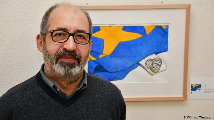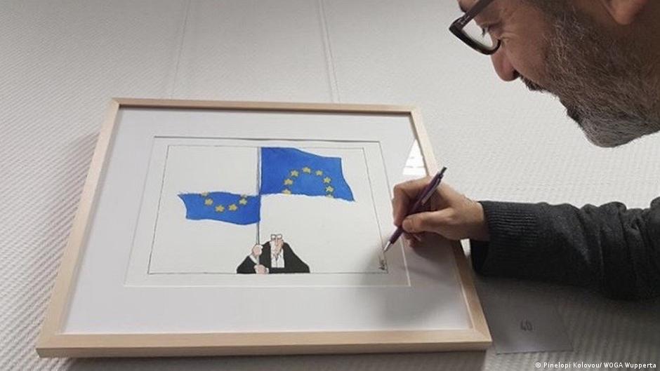 Για τον Μιχάλη Κουντούρη, πολυβραβευμένο πολιτικό γελοιογράφο της Εφημερίδας των Συντακτών και συνεργάτη διεθνών μέσων όπως το Courrier International, η πολιτική γελοιογραφία ως εικαστικό και δημοσιογραφικό είδος, τα τελευταία χρόνια «γίνεται ολοένα πιο περίπλοκη γιατί δυσκολεύει και η θεματολογία. Και όσο δυσκολεύει η θεματολογία γίνεται όλο και πιο δύσκολη η ψυχολογική διαχείρισή της από τον πολιτικό γελοιογράφο», λέει ο ίδιος, έχοντας ήδη διανύσει 34 χρόνια στον χώρο. Τα δύσκολα θέματα που καλείται να καταγράψει σήμερα ένας πολιτικός καρικατουρίστας φάνηκαν στην έκθεσή του με τίτλο «Μade in Europe», που παρουσίασε πρόσφατα στο Βούπερταλ στο πλαίσιο της εβδομάδας ανοιχτών ατελιέ της πόλης (WOGA). Στους τέσσερις ορόφους του κοινωφελούς οργανισμού «Der Paritätische» μπορούσε κανείς να δει μια ανασκόπηση της πολιτικής, κοινωνικής, οικονομικής αλλά και περιβαλλοντικής πραγματικότητας των τελευταίων χρόνων.