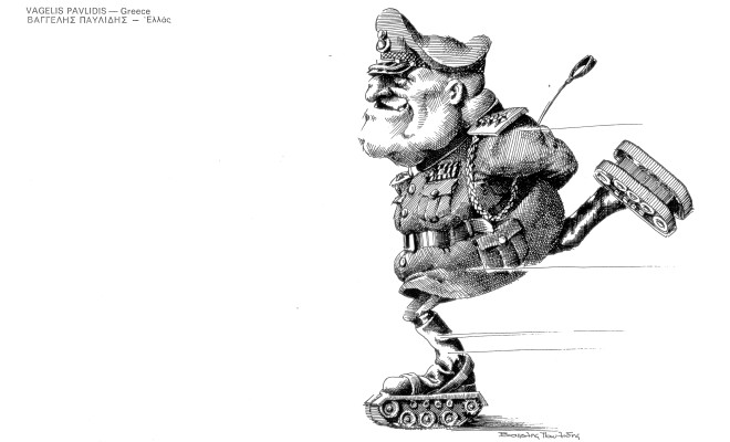 Γενικά στον χώρο της γελοιογραφίας έχουμε μία πλούσια παράδοση, άγνωστη στο ευρύ κοινό. Το σκίτσο της ανάρτησης αποτελεί μέρος του βιβλίου από την έκθεση του 1975 που προανέφερα και είναι των εκδόσεων Καστανιώτη. Αν το βρείτε αξίζει να το αγοράσετε διότι πέρα από τα εξαιρετικής ποιότητας σκίτσα θα βρείτε κι άλλους Έλληνες σκιτσογράφους όπως ο ΚΥΡ ή ο Μαρουλάκης , στα πρώτα τους βήματα οι πιο πολλοί.