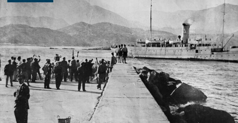 Λένε λοιπόν ότι η Κάρπαθος δεν έχει σπουδαία ναυτική ιστορία. Όμως δεν είναι αλήθεια κι απόδειξη είναι ετούτο το μοναδικό ντοκουμέντο, που δείχνει περίπου 80 ανθρώπους να χαιρετούν μπροστά στον φωτογράφο.