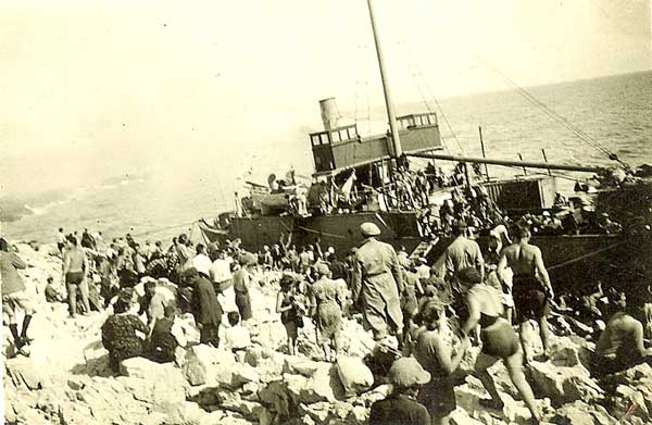 May 1939 photos of a boat that stopped in Rhodes en route to Palestine from Prague and Braslava carrying about 600 Jews. In Rhodes several young Rhodeslis joined the refugees. But before the vessel had traveled far from Rhodes a fire broke out on board. The passengers safely reached the Island of Samos, and returned back to Rhodes. The Eastern European Jews were allowed to sleep in the stadium. In a short time, the Rhodes Jewish community managed to obtain another ship and the refugees sailed for Palestine.