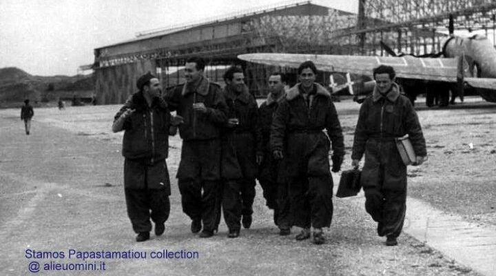 Ιταλοί πιλότοι και πίσω δύο από τα μεγάλα hangars του αεροδρομίου Μαριτσών