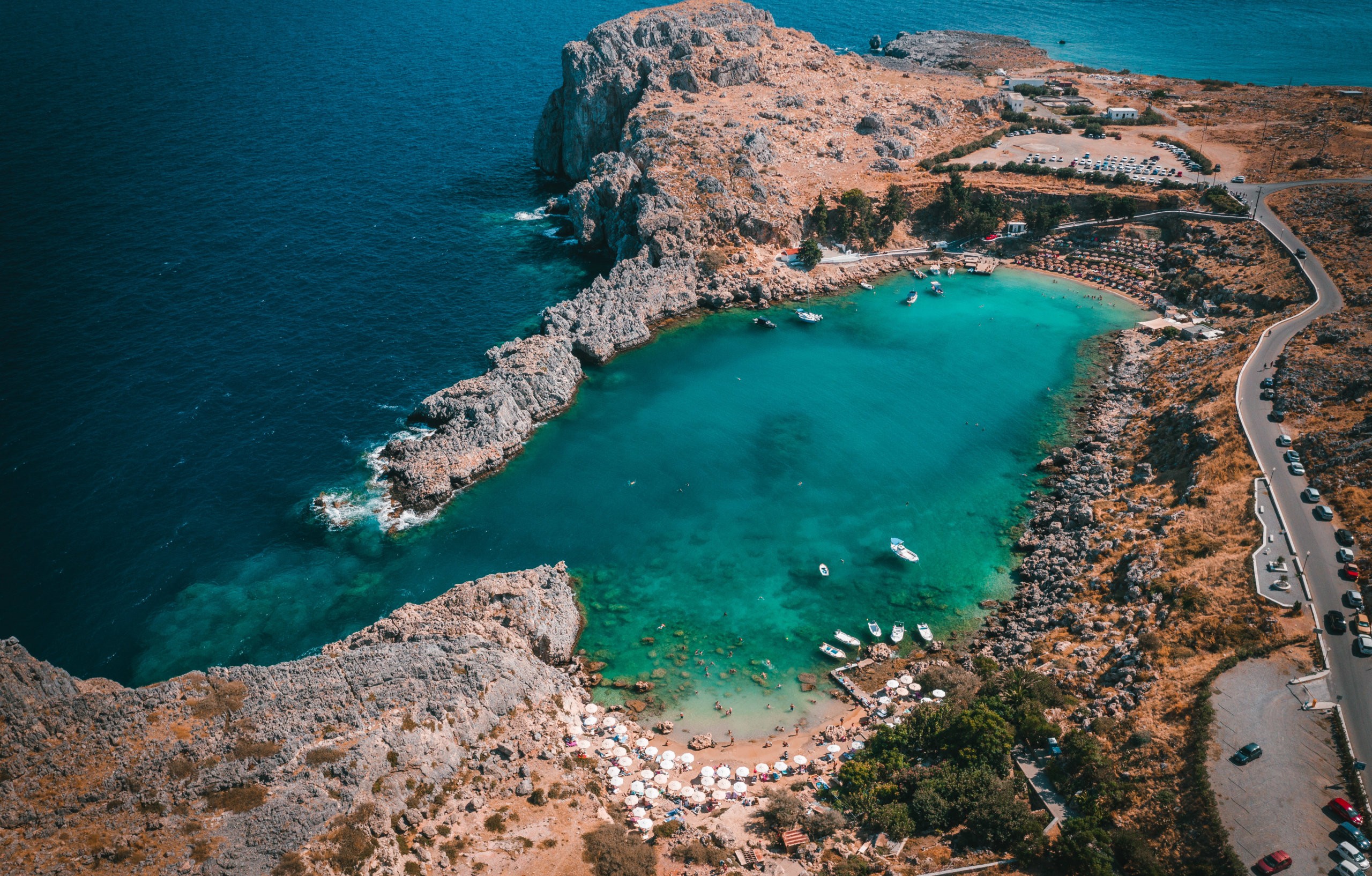 Λίνδος: Κάτω από τον ομώνυμο οικισμό, συγκεντρώνει πολύ κόσμο, δύο αμμουδιές με ομπρέλες, ξαπλώστρες και ταβέρνες.