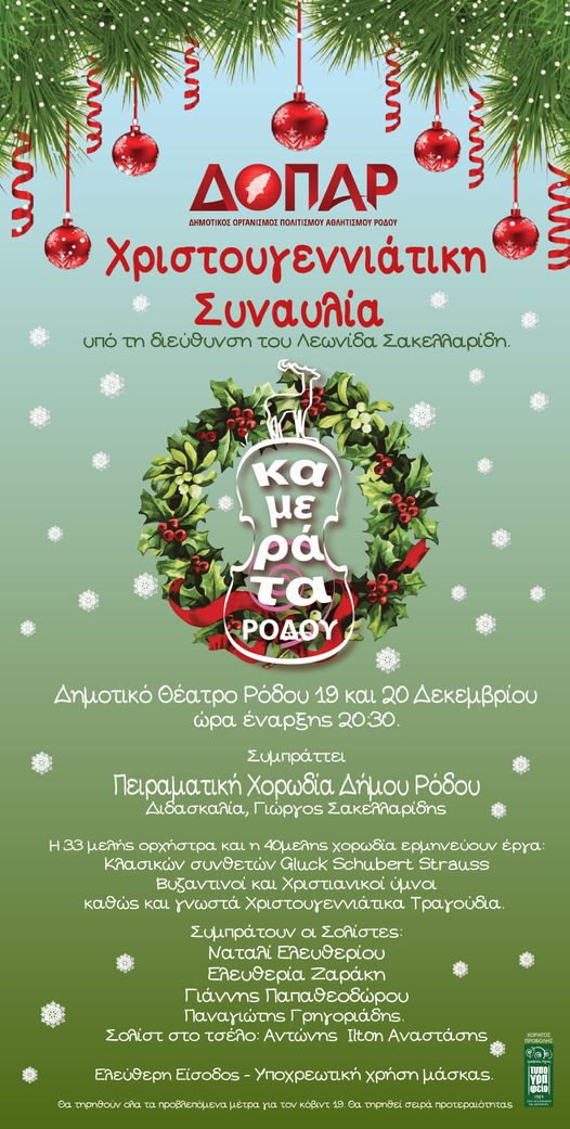 Ο ΔΟΠΑΡ διοργανώνει Χριστουγεννιάτικη συναυλία με την Kαμεράτα Ρόδου υπό τη διεύθυνση του Λεωνίδα Σακελλαρίδη παρουσιάζοντας ένα πρόγραμμα συμφωνικής μουσικής που περιέχει έργα κλασσικών συνθετών (Gluck, Strauss, Schubert), επεξεργασίες Βυζαντινών και Δυτικών Χριστουγεννιάτικων ύμνων καθώς και δημοφιλή Χριστουγεννιάτικα τραγούδια. Μαζί συμπράττει η Πειραματική Χορωδία Δήμου Ρόδου σε διδασκαλία του διευθυντή της: Γιώργου Σακελλαρίδη. Τραγουδούν: Ναταλί Ελευθερίου, Ελευθερία Ζαράκη, Γιάννης Παπαθεοδώρου και Παναγιώτης Γρηγοριάδης. Σολίστ στο τσέλο: Αντώνης Ιλτον Αναστάσης. Κυριακή 19 και Δευτέρα 20 Δεκεμβρίου με ώρα έναρξης 8.30 στο Δημοτικό Θέατρο Ρόδου. Ισχύουν οι περιορισμοί που αφορούν την covid 19 και είναι απαραίτητη η χρήση μάσκας. Θα τηρηθεί σειρά προτεραιότητας κατά της είσοδο