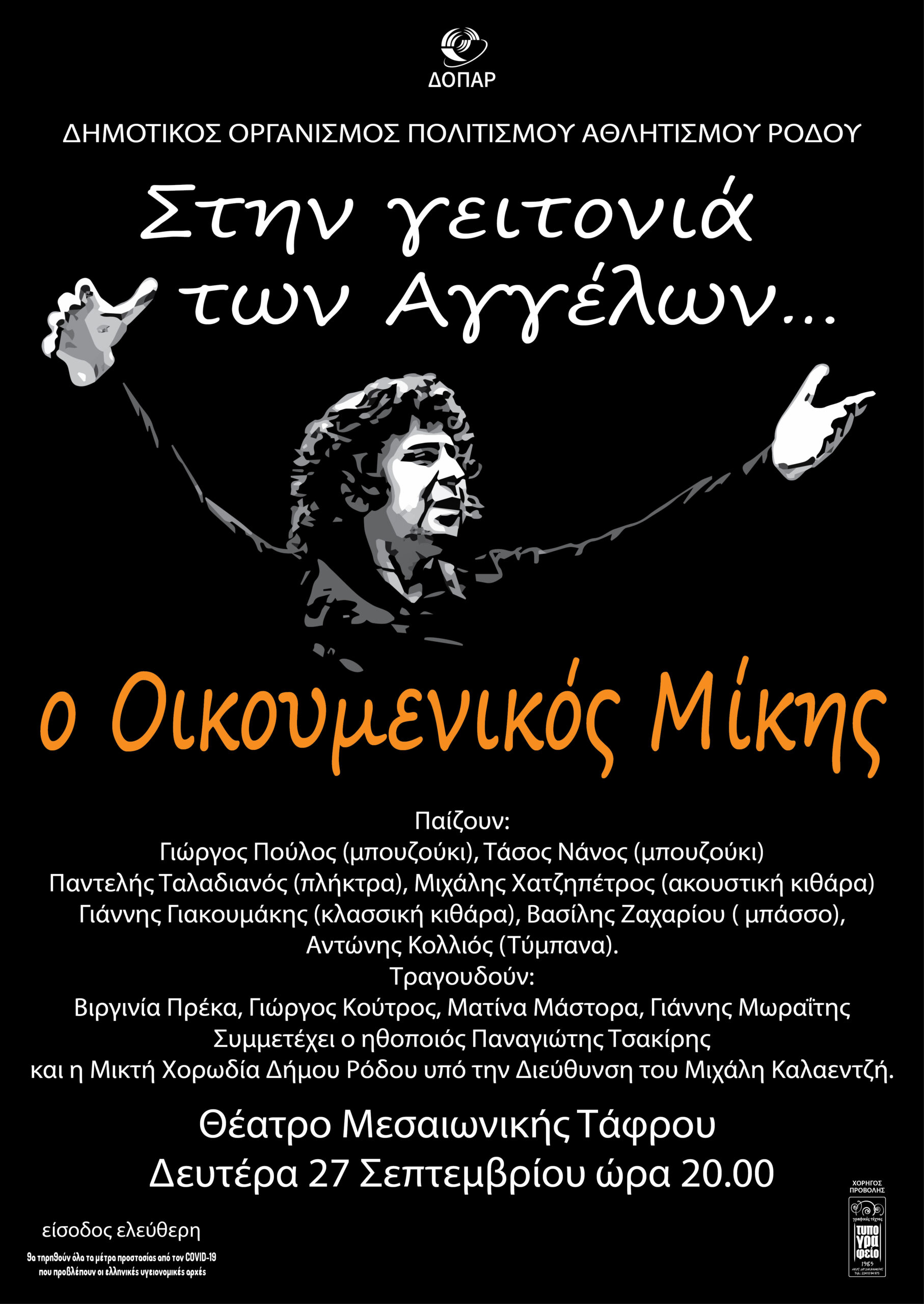 Την Δευτέρα 27 Σεπτεμβρίου στο θέατρο της Μεσαιωνικής Τάφρου ΜΕΛΙΝΑ ΜΕΡΚΟΥΡΗ στις 20.00 ο Δημοτικός Οργανισμός Πολιτισμού Αθλητισμού Ρόδου διοργανώνει μια μεγάλη συναυλία για τον Οικουμενικό Μίκη με τίτλο “Στην γειτονιά των Αγγέλων ”
