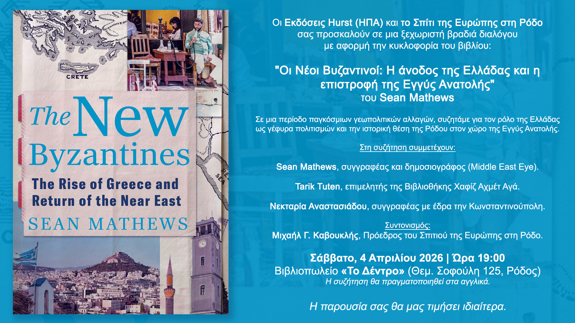 Οι Εκδόσεις Hurst (ΗΠΑ) σε συνεργασία με το Σπίτι της Ευρώπης στη Ρόδο, σας προσκαλούν στην παρουσίαση και συζήτηση γύρω από το νέο βιβλίο του δημοσιογράφου Sean Mathews, με τίτλο «The New Byzantines: The Rise of Greece and Return of the Near East».