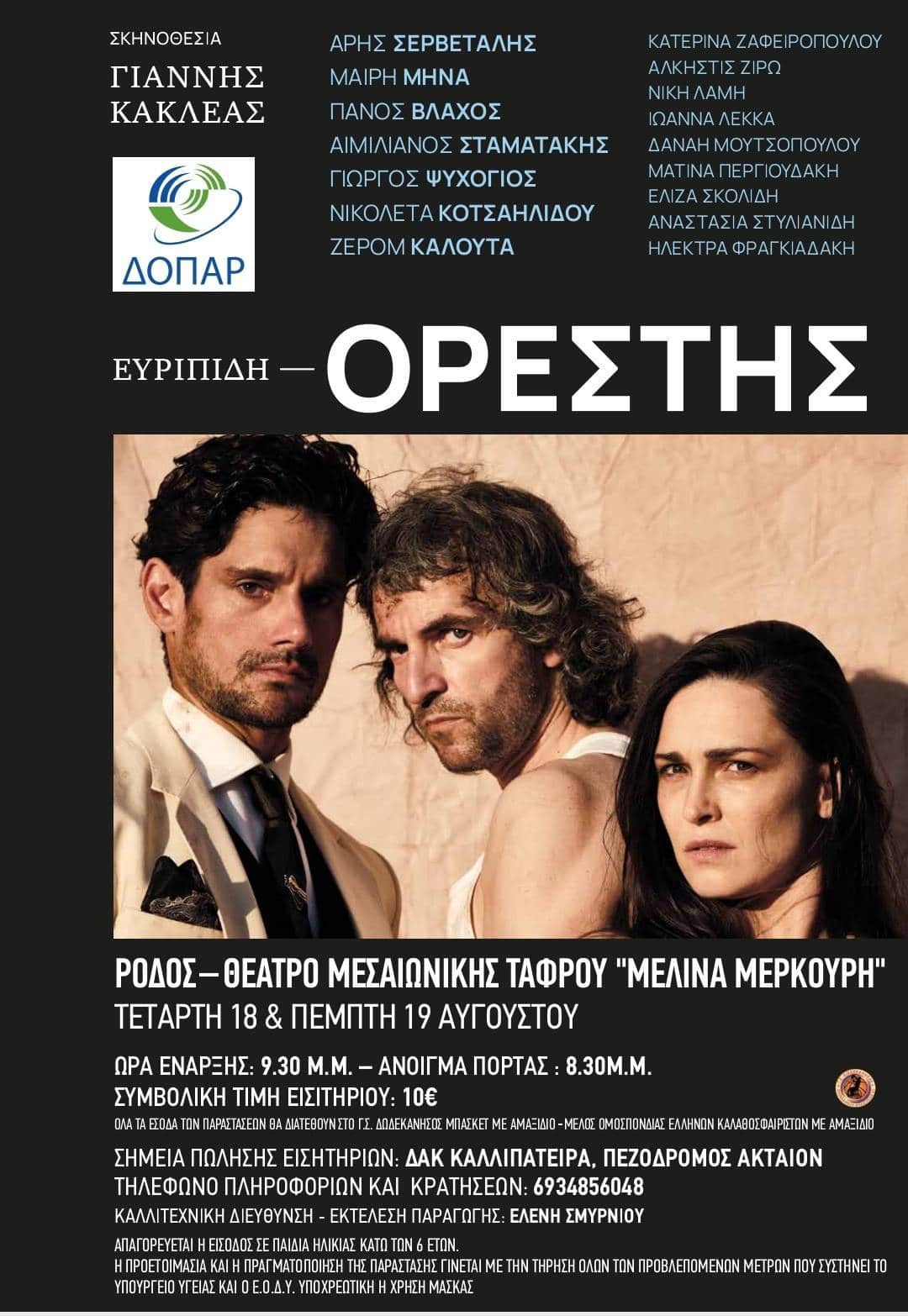 Ο ΔΟΠΑΡ στα πλαίσια των θερινών πολιτιστικών εκδηλώσεων του νησιού μας παρουσιάζει την παράσταση ” ΟΡΈΣΤΗΣ” του Ευριπίδη σε σκηνοθεσία Γιάννη Κακλέα.