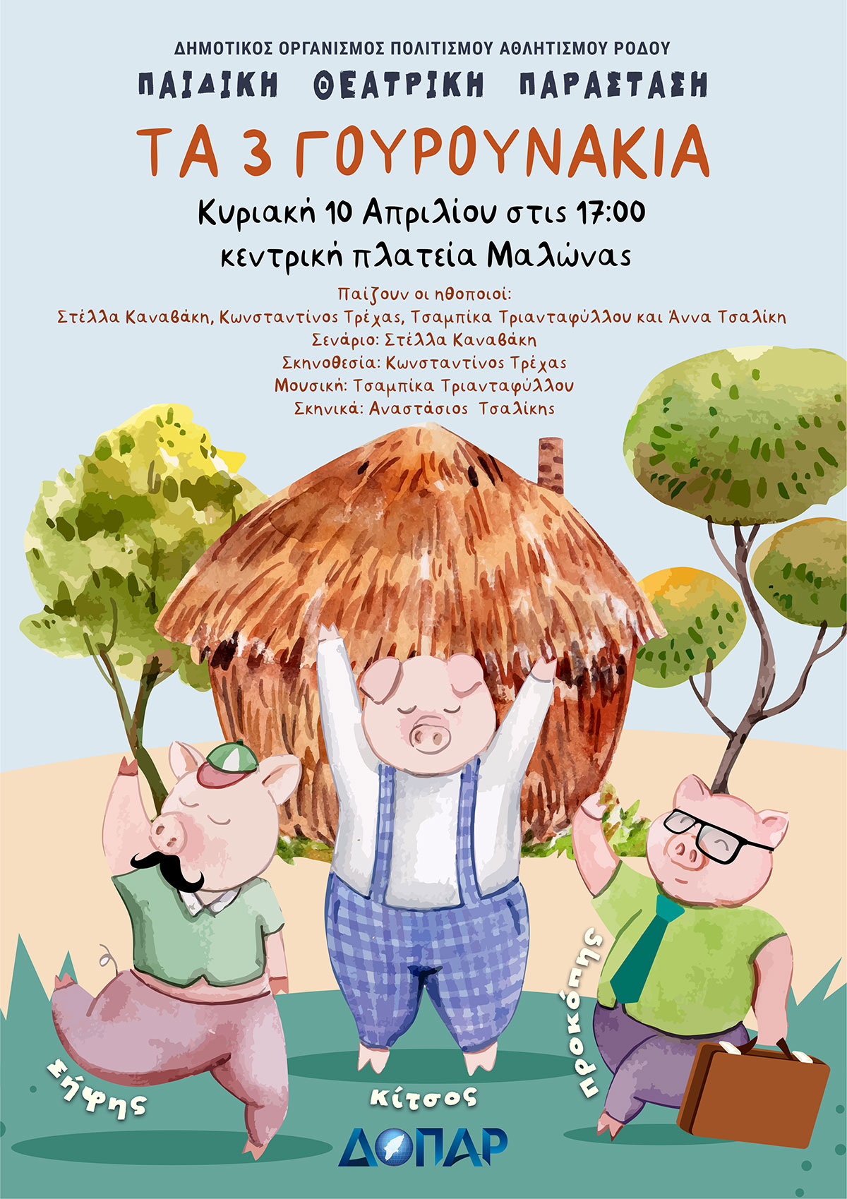 Ο Δημοτικός Οργανισμός Πολιτισμού Αθλητισμού Ρόδου ξεκινάει μια σειρά παιδικών παραστάσεων με τίτλο «Τα 3 γουρουνάκια» που θα πραγματοποιηθούν σε Δημοτικές Ενότητες του νησιού μας .
