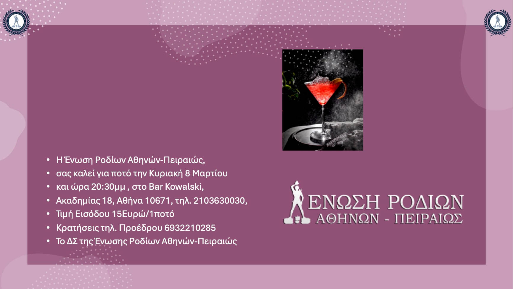 ΠΡΟΣΚΛΗΣΗ ΑΠΟ ΤΗΝ ΕΝΩΣΗ ΡΟΔΙΩΝ ΓΙΑ ΠΟΤΟ